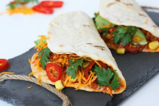 TORTILLA chilli con carne bolognese 150g, fasole rosie 70g, coriandru, usturoi, sare, ardei iute,mozzarella 30g, cartofi pai 200g, ketchup 50,00 RON